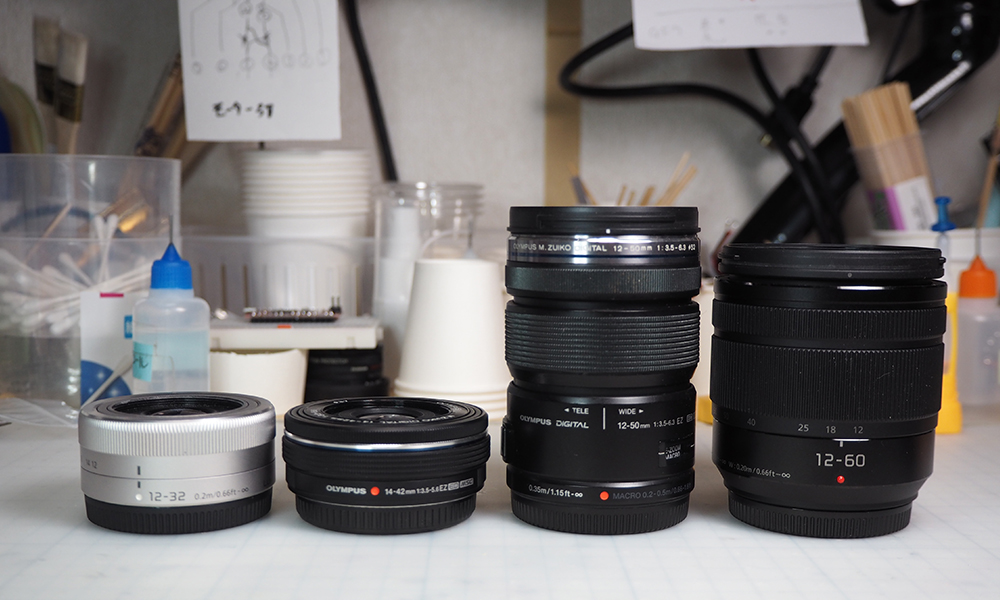(左からLumix H-FS12032、Olympus M.ZUIKO ED 14-42、Olympus M.ZUIKO ED12-50、Lumix H-FS12060)